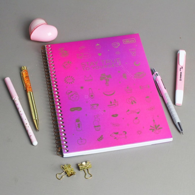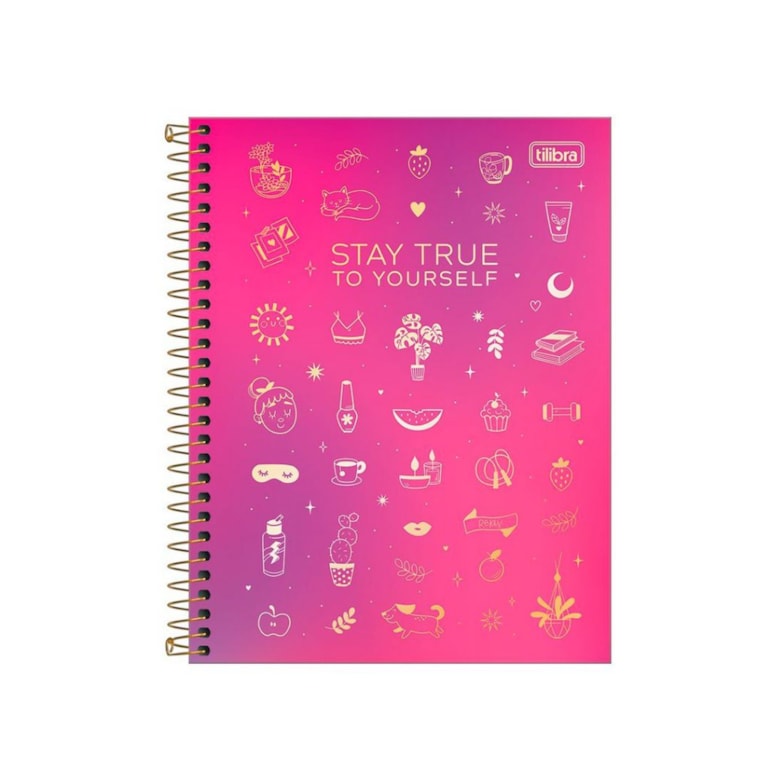 O Caderno Colegial Doodles True To Yourself Rosa 80 Folhas tem acabamento em wire-o dourada, e conta com uma capa graciosa estampada com vários símbolos fofos e comidinhas com a frase “Stay true to yurself”!