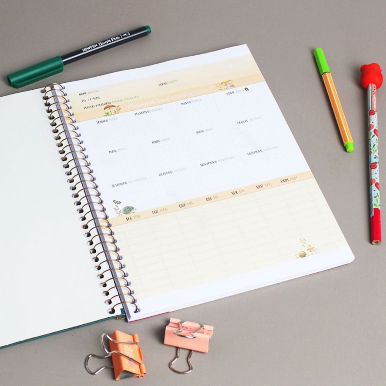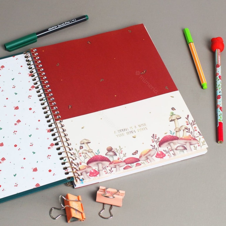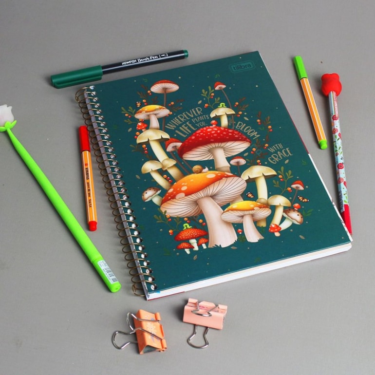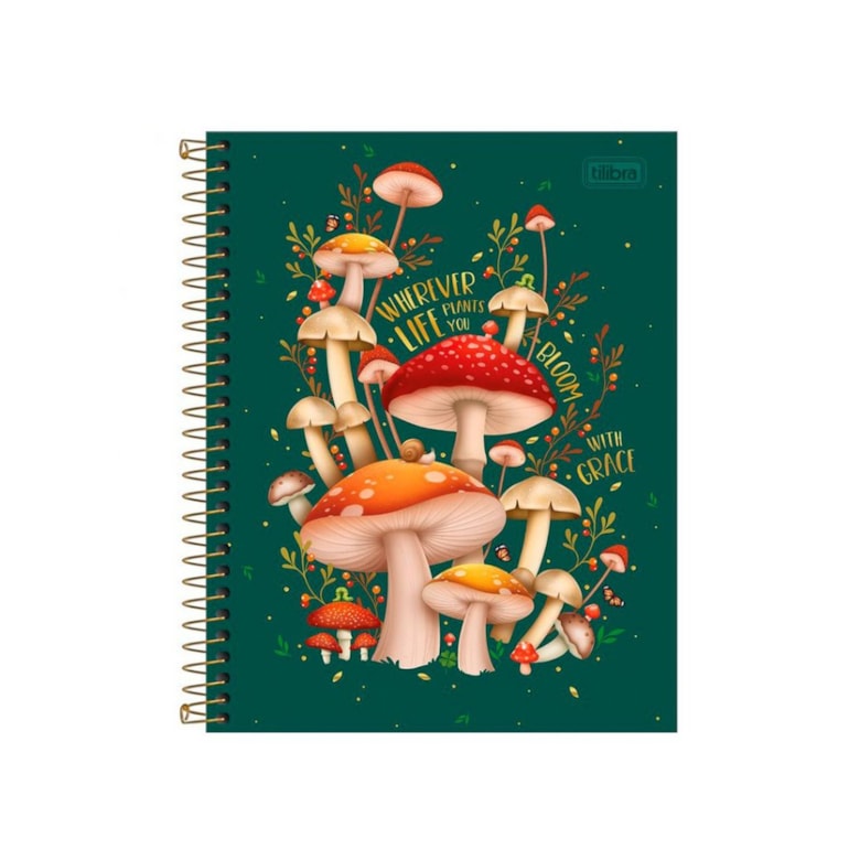 O Caderno Colegial Loveland Cogumelo Verde 80 Folhas tem acabamento em wire-o dourada, e conta com uma capa belíssima estampada com lindos e detalhados cogumelos sobre um fundo verde escuro, ela ainda conta com a frase “Wherever life plants you, bloom with grace, "Onde quer que a vida te plante, floresça com graça".