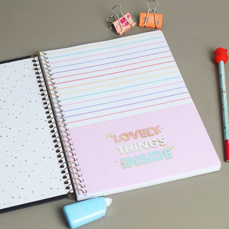 Super completinho, tem tamanho médio e é ótimo para ser usado durante a sua rotina, é compacto e cabe com bastante facilidade na sua bolsa! Ele possui ao todo 80 folhas pautadas, 1 envelope de papel e uma linda cartela de adesivos, é exatamente o que você precisava!