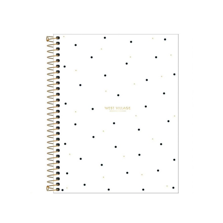 O Caderno Colegial West Village Poá 80 Folhas tem acabamento em wire-o dourada, e conta com uma capa charmosa com dois padrões de poá, sendo um preto e um dourado, ambos sobre um fundo branco!
