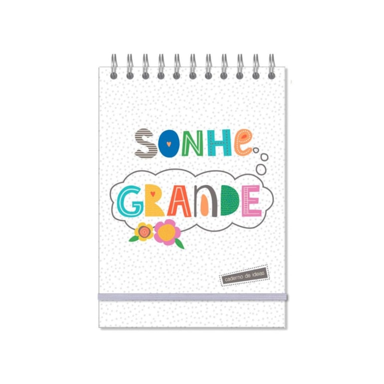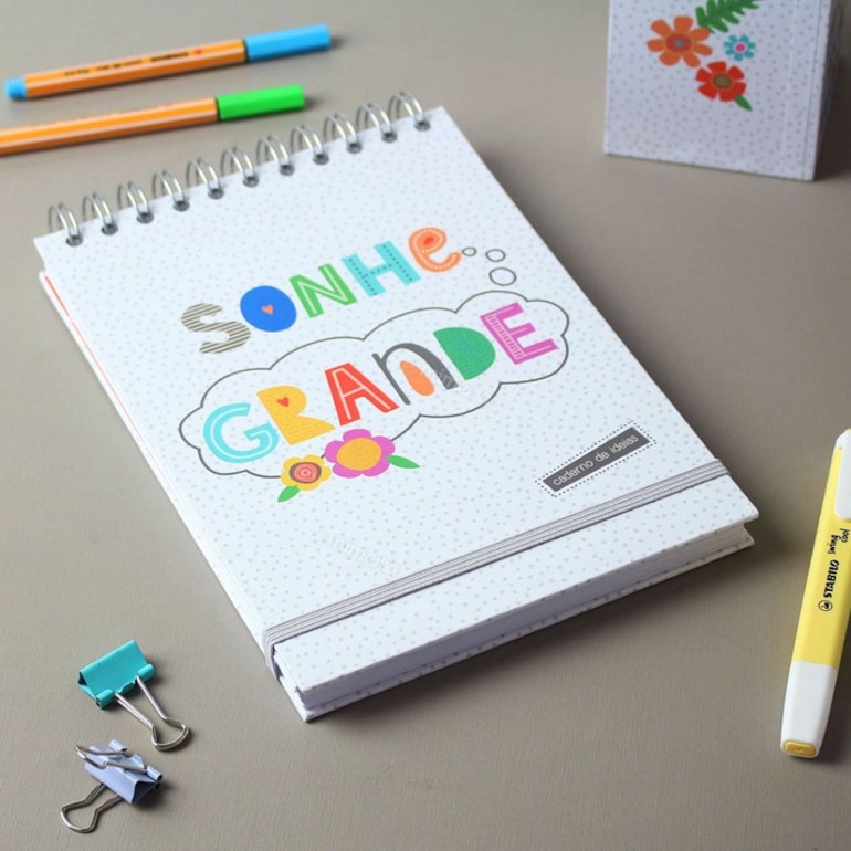 Lindo, este caderno tem capa dura estampada com a frase: “Sonhe grande” em fundo branco com detalhes de flores coloridas. Um charme de caderno para você usar, decorar sua mesa ou presentear pessoas queridas em datas especiais!