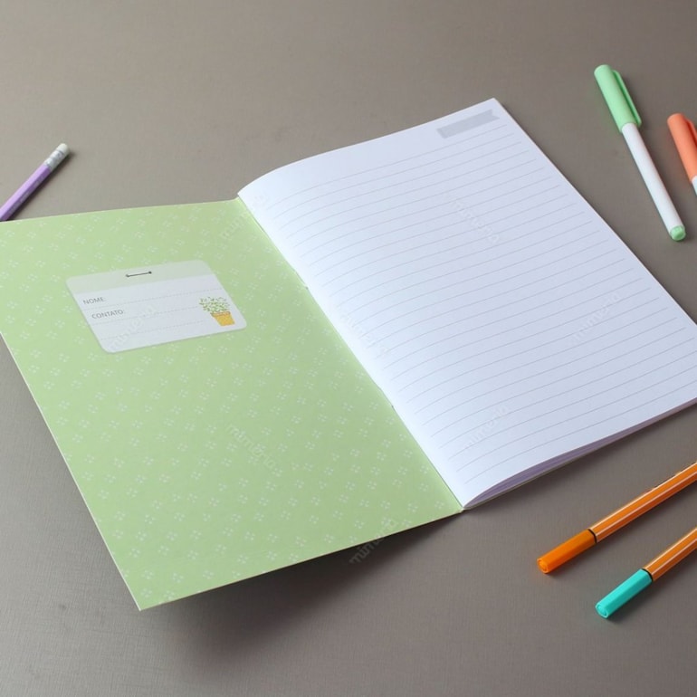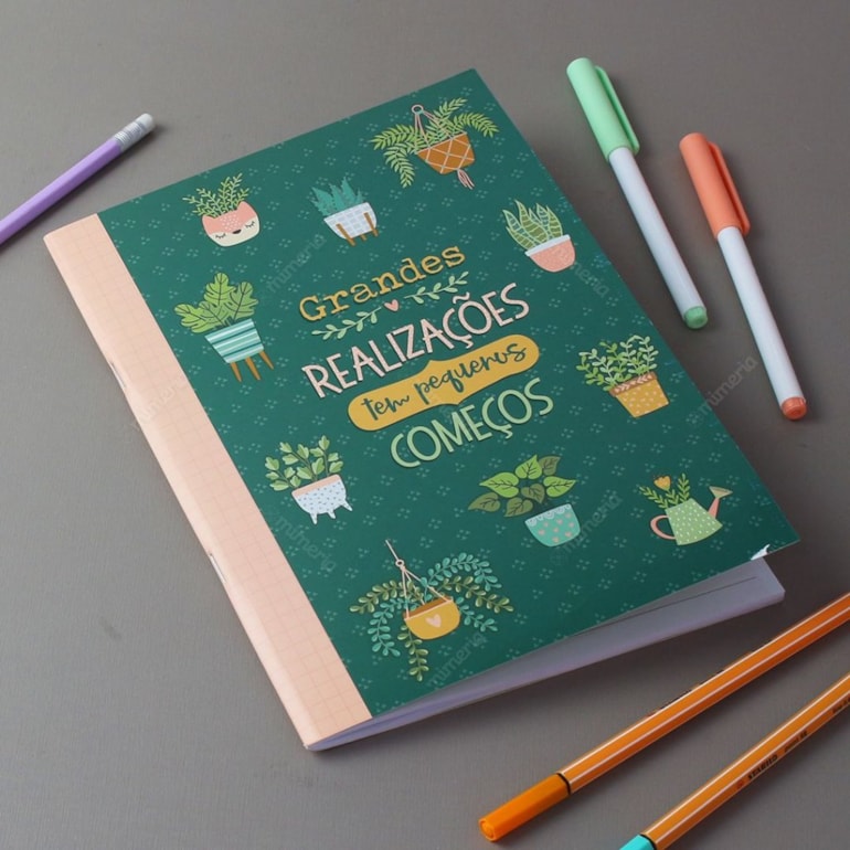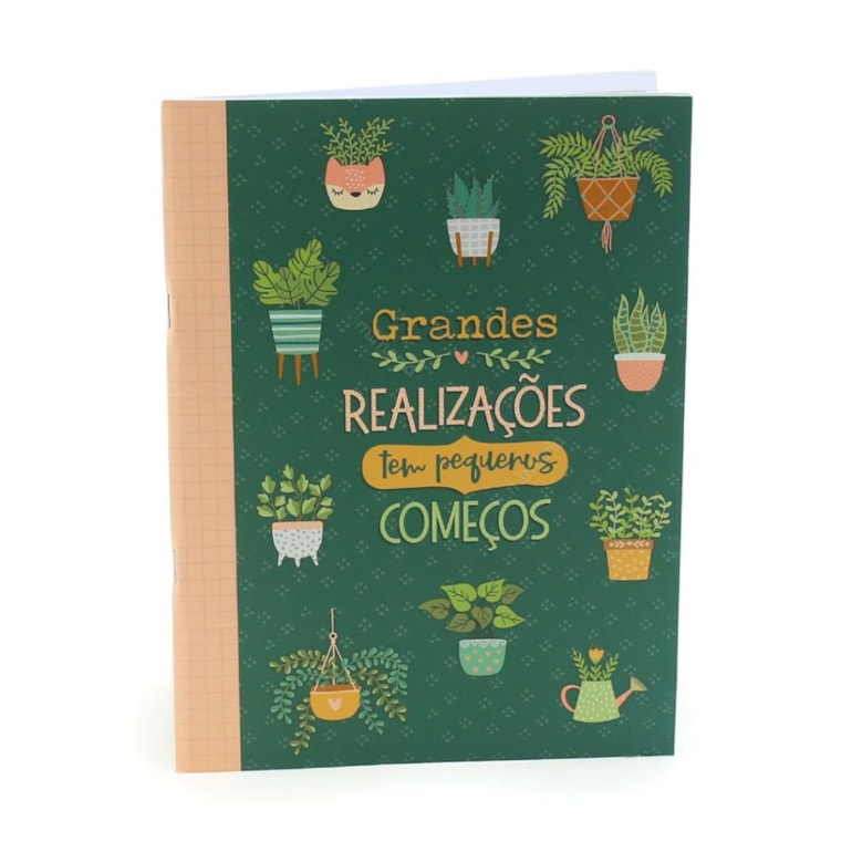 O Caderno Flexível Garden além de usual, tem linda estampa com a frase: “Grandes realizações tem pequenos começos” em fundo verde com desenhos de plantas e outros elementos de jardim. Um charme!