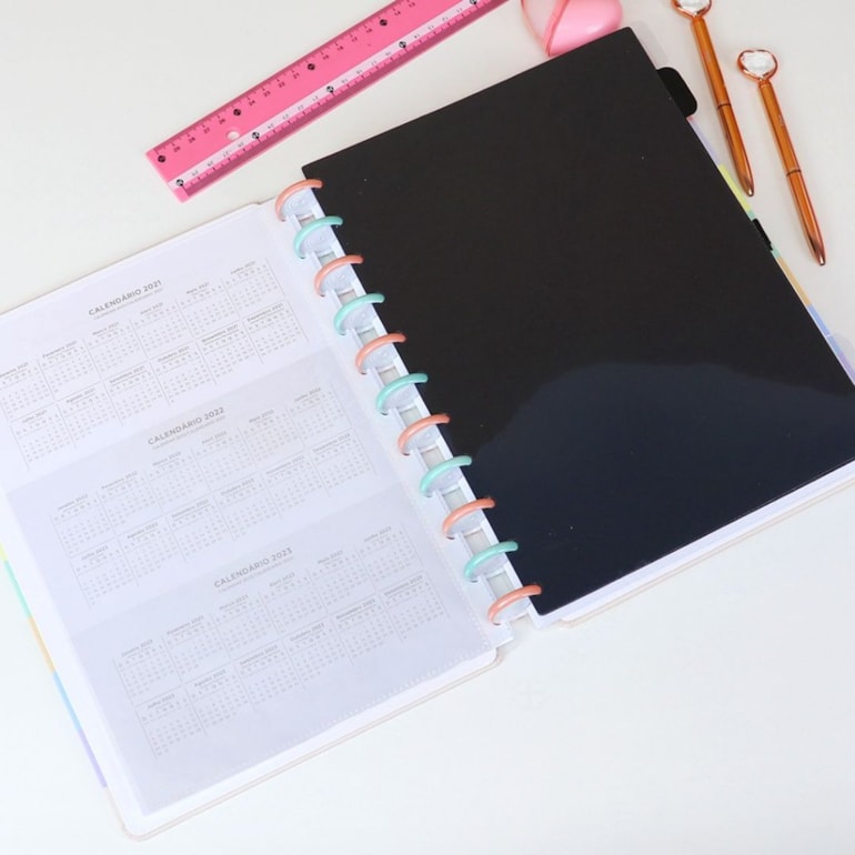 Ele é lindo e conta com 140 folhas pautadas, 1 porta caneta elástico, 4 divisórias resistentes, um envelope de plástico, e ainda tem seu fechamento através de um elástico resistente em sua capa, o mimo mais perfeito da vida! Ele também conta com 3 calendários (2021, 2022, 2023) e vem estampado com listras ultra coloridinhas que representam as cores do arco-íris em tons pastéis, tudo o que você precisava!