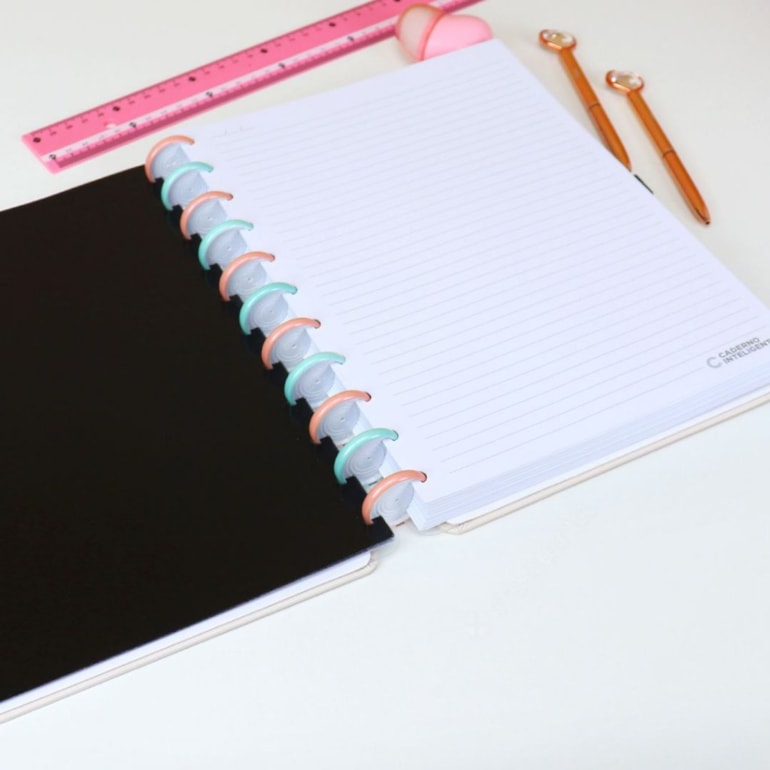 O Caderno Inteligente Arco-Íris Pastel Grande é totalmente personalizável e tem suas folhas customizadas, elas podem ser retiradas e reposicionadas sempre que necessário, pois podem ser realocadas sem a necessidade de rasgar, cortar, ou do uso de grampos e ferragens de metal. Todo o poder da versatilidade nas suas mãos!