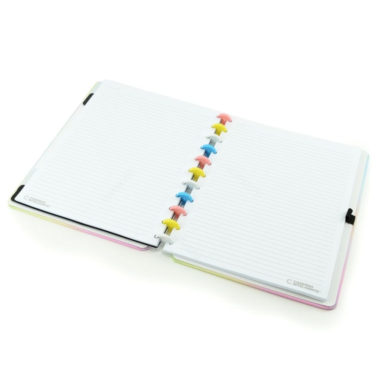 O Caderno Inteligente Splash Grande conta com capa dura toda colorida com candy colors, vem com divisórias, folhas pautadas e folhas brancas, porta-caneta elástico e, ainda, possui sistema inteligente: você tira e coloca folhas quando quiser. Não é perfeito?