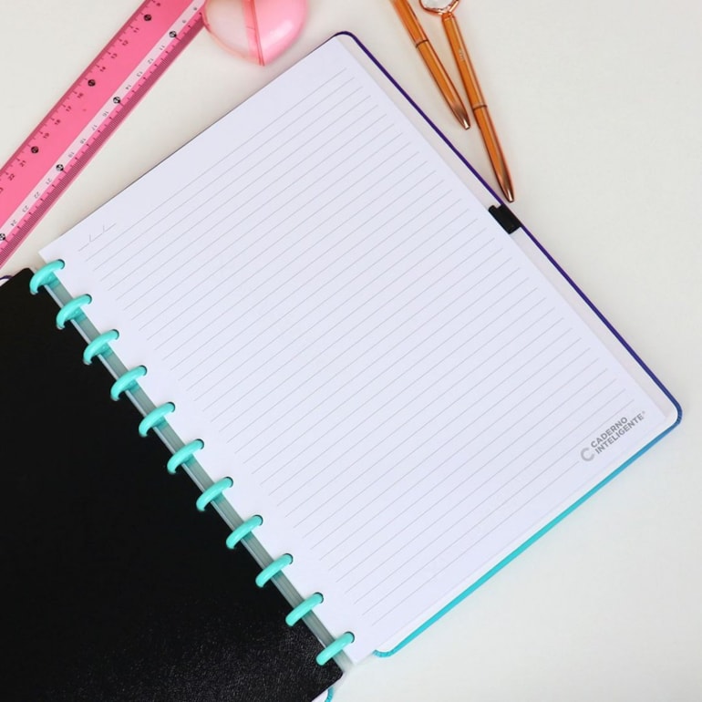 O Caderno Inteligente Mistic Glow Grande é totalmente personalizável e tem suas folhas customizadas, elas podem ser retiradas e reposicionadas sempre que necessário, pois podem ser realocadas sem a necessidade de rasgar, cortar, ou do uso de grampos e ferragens de metal, ele vai te proporcionar toda a flexibilidade e praticidade que você precisa!