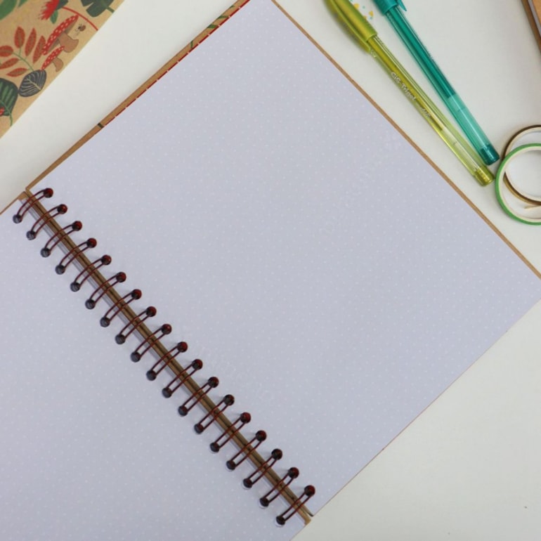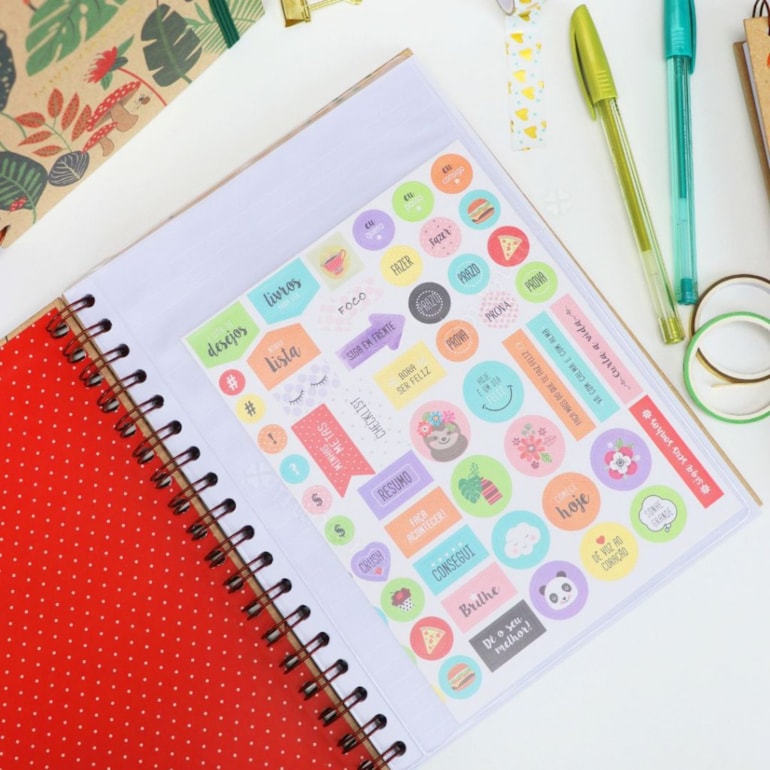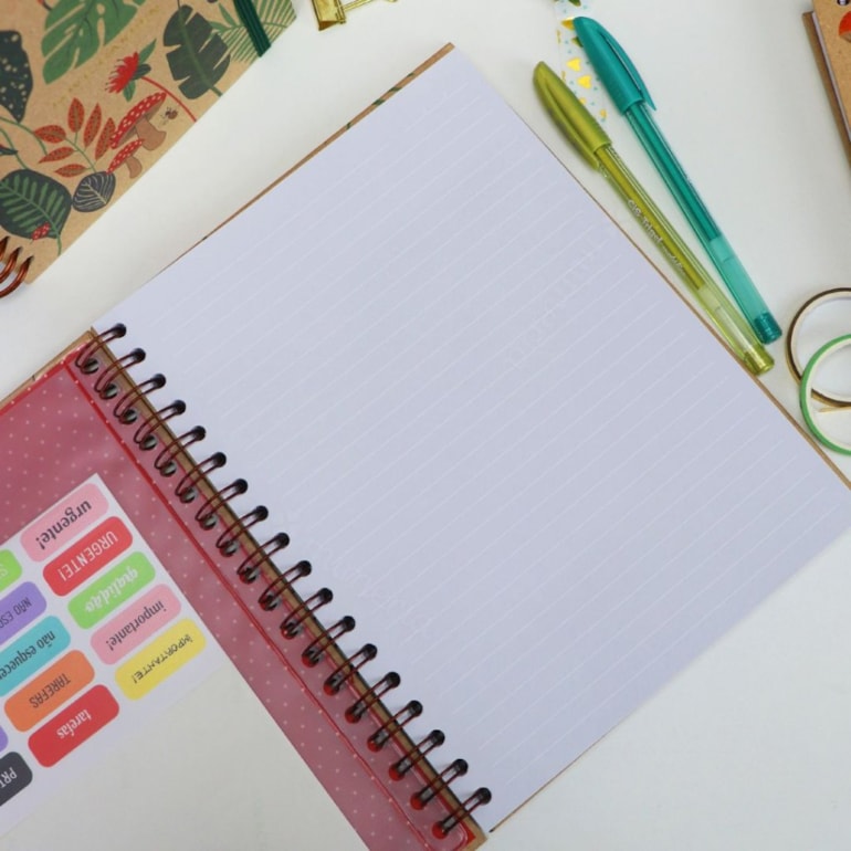 Ele tem 40 folhas pontilhadas e 40 folhas pautadas, perfeitas para serem utilizadas como você preferir. Conta com fechamento em elástico, 1 cartela de adesivos variados, 1 envelope plástico, ideal para guardar documentos, bilhetes, papéis e afins. Além disso, o caderno tem um design mega delicado – fundo bege e estampas que remetem à flora de um lindo jardim. É um mimo, né?