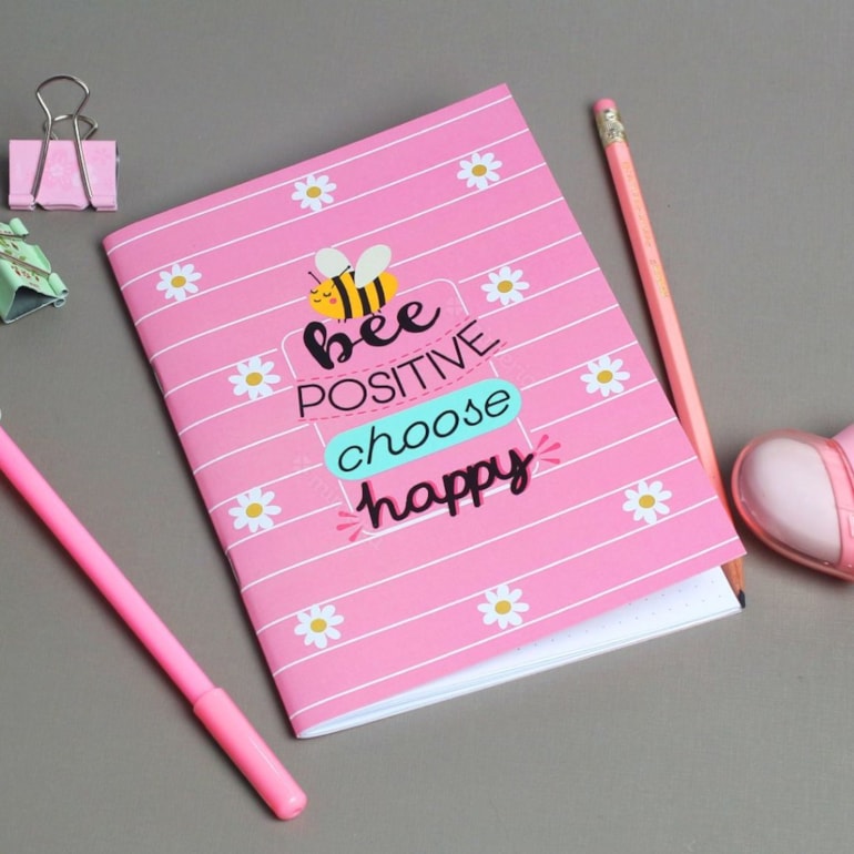 Ele conta ao todo com 60 páginas pontadas e vem decoradinho com uma capa belíssima estampada com uma abelha, e a frase “bee positive choose happy” sobre um fundo rosa listrado com margaridas! exatamente tudo o que te faltava!
