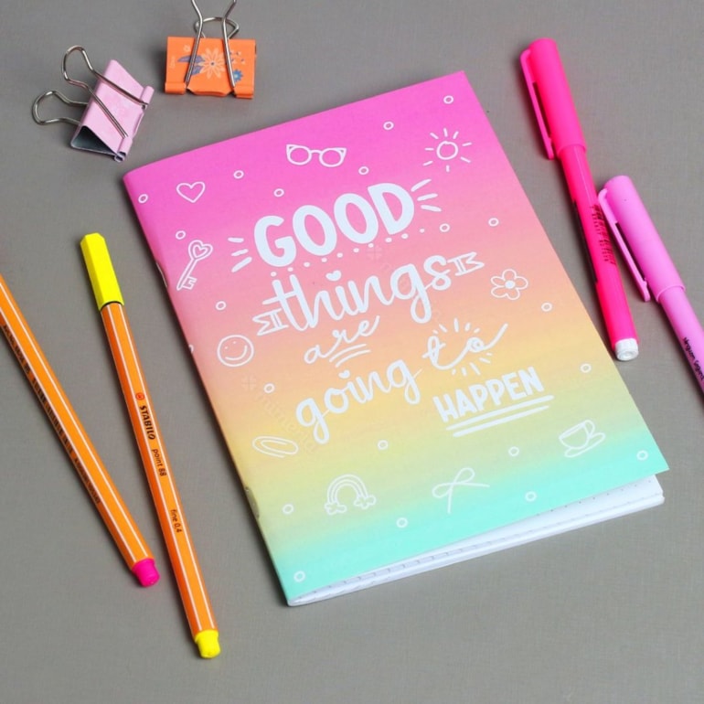 Ele conta ao todo com 60 páginas pontadas e vem decoradinho com uma capa linda estampada com um degradê belíssimo que remete ao pôr do sol e conta com a frase “ Good things are going to happen”, exatamente tudo o que te faltava!