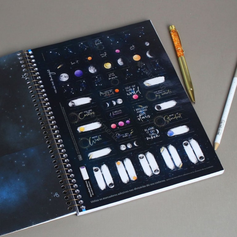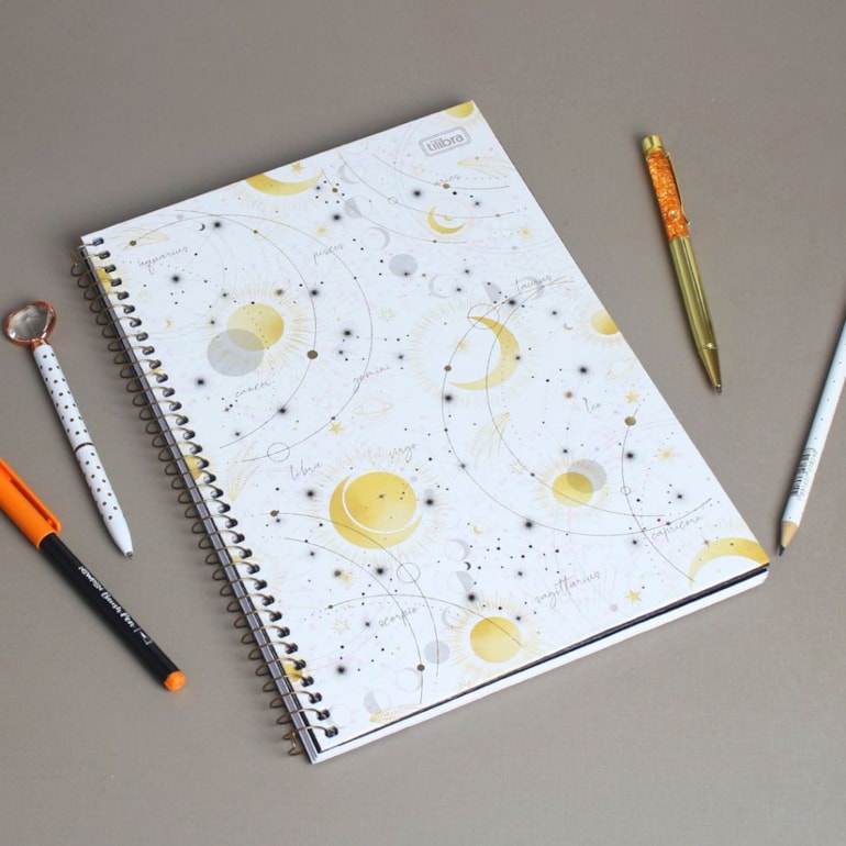 Para as minhas esotéricas de plantão, o Caderno Universitário Magic Sol e Lua 80 Folhas é o mimo perfeito! Completamente lindo, ele vem com uma capa belíssima estampada com a lua e o sol sempre juntos em dourado, sobre um fundo ornamentado com as fases da lua, constelações e os nomes dos 12 signos do zodíaco!