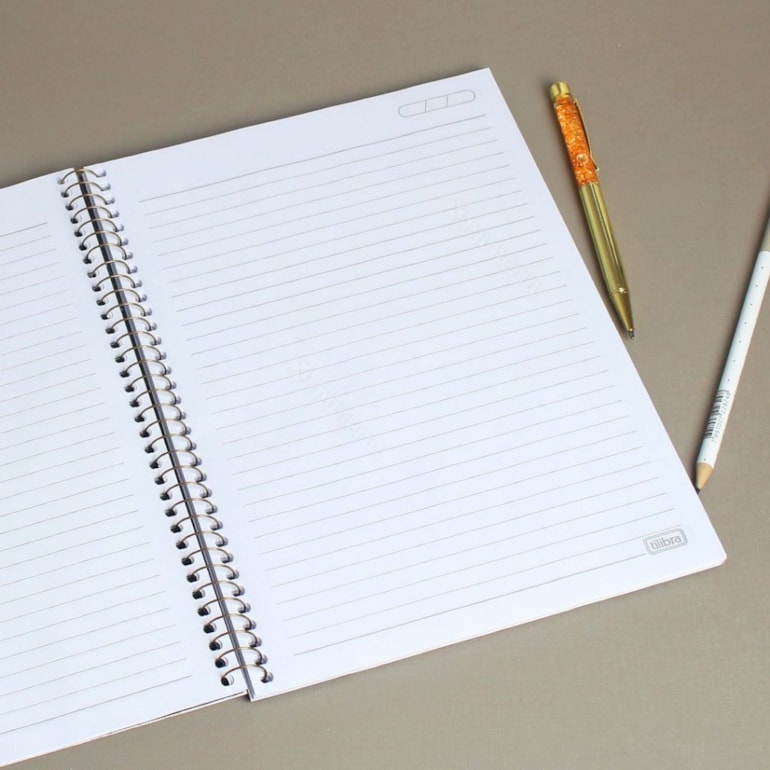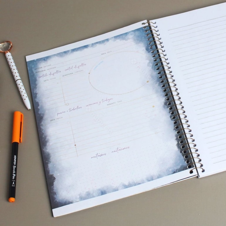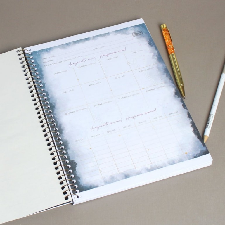 Mega completo, ele conta com 80 folhas pautadas distribuídas em uma matéria, seu acabamento é em espiral dourada e ele ainda possui uma página com espaço para organizar todas as suas anotações com campos para planejamento anual e semanal, é absolutamente tudo o que você poderia querer!