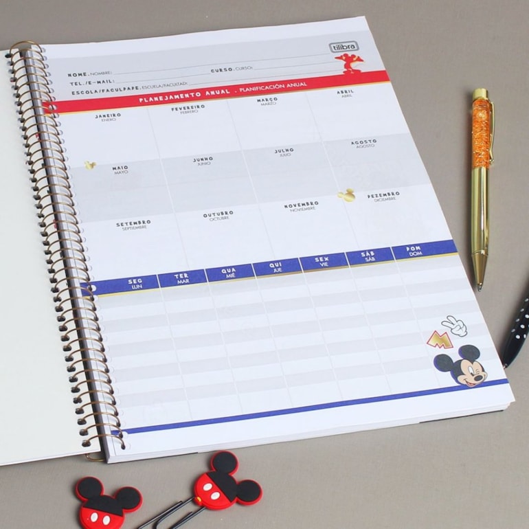 Mega completo, conta ao todo com 80 folhas pautadas distribuídas em uma matéria, seu acabamento é em espiral dourada e ele ainda possui uma página com espaço para organizar todas as suas anotações, tendo campos para planejamento anual e semanal. É tudo o que você poderia querer!