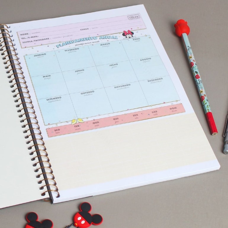 Ultra completinho, conta ao todo com 80 folhas pautadas distribuídas em uma matéria, seu acabamento é em espiral dourada e ele ainda possui uma página com espaço para organizar todas as suas anotações, tendo campos para planejamento anual e semanal. É exatamente o que te faltava!
