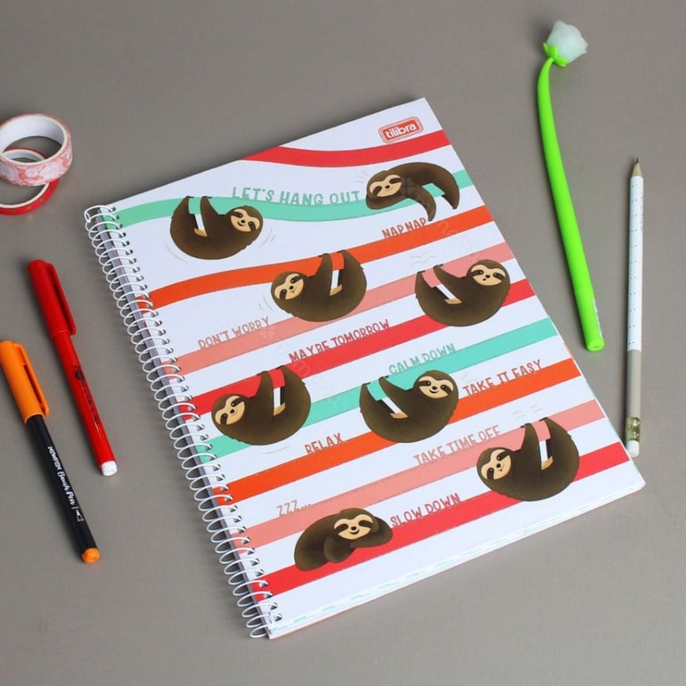 Para quem é apaixonado por preguicinhas, o Caderno Universitário Nap Nap Calm Down 80 Folhas vai ser o mimo ideal para você! Ele é uma gracinha e vem estampado com várias preguiças super fofinhas agarradas a galhos coloridos que possuem frases divertidas e despreocupadas, um verdadeiro mimo!