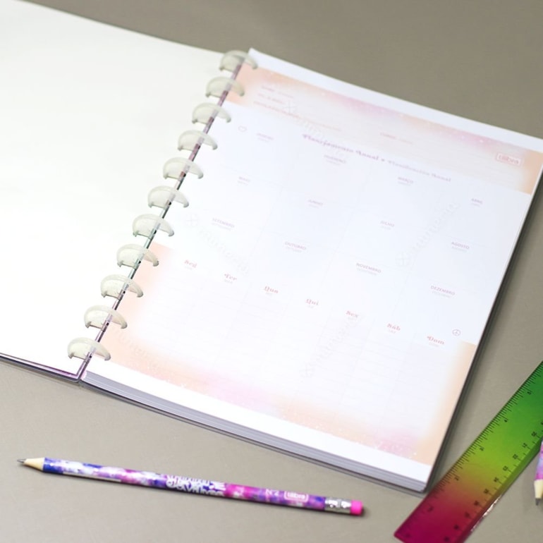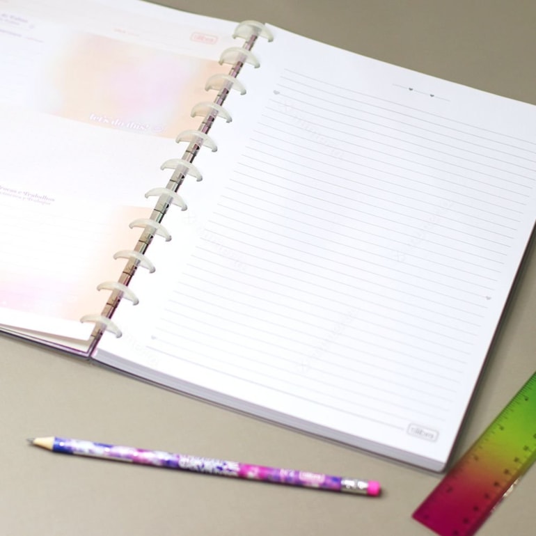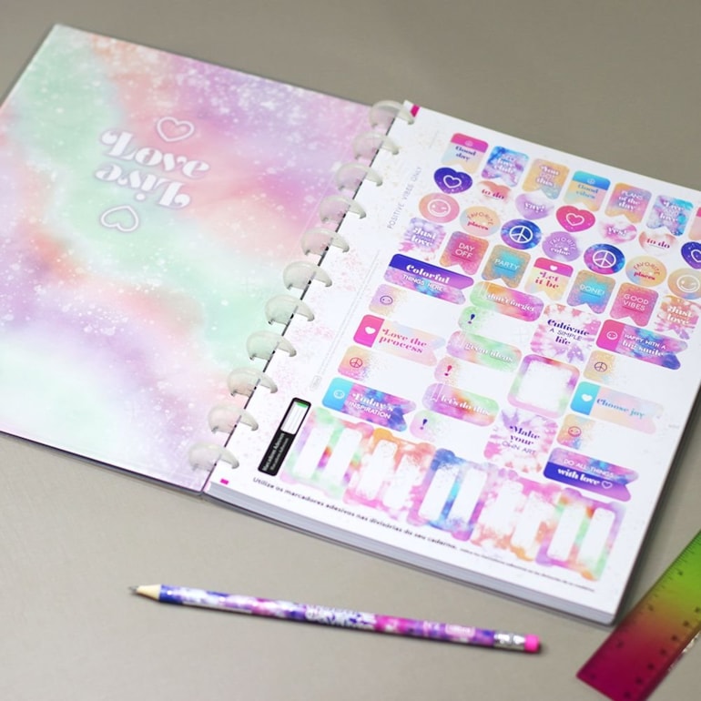 O Caderno Universitário Tidilisco Good Vibes vem com tudo incluso para você mesma fazer a montagem dele na sua casa! Ele é lindo e vem todo estampado com um tie dye em verde, roxo e rosa com uma vibe toda “Good Vibes”, é o mimo perfeito pra quem ama ter a experiência de montar o próprio caderno!