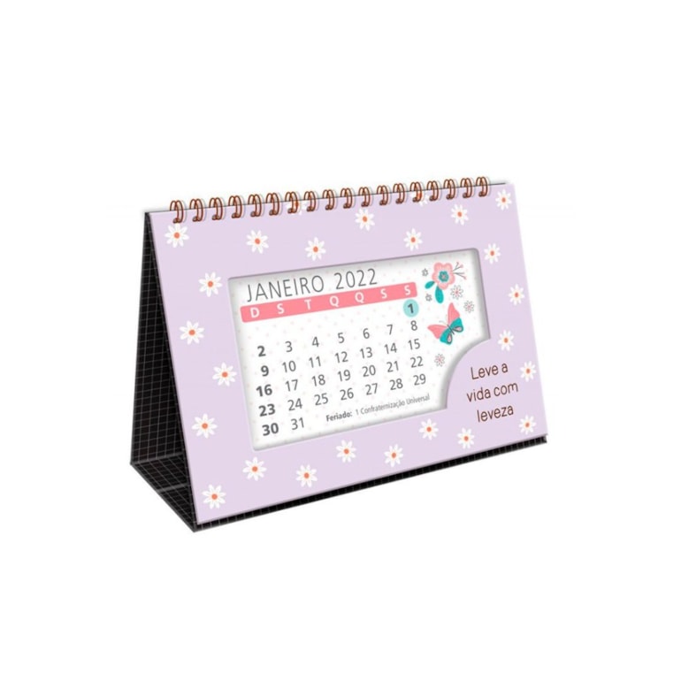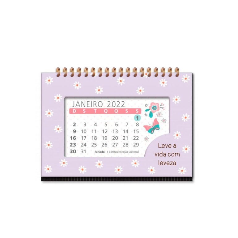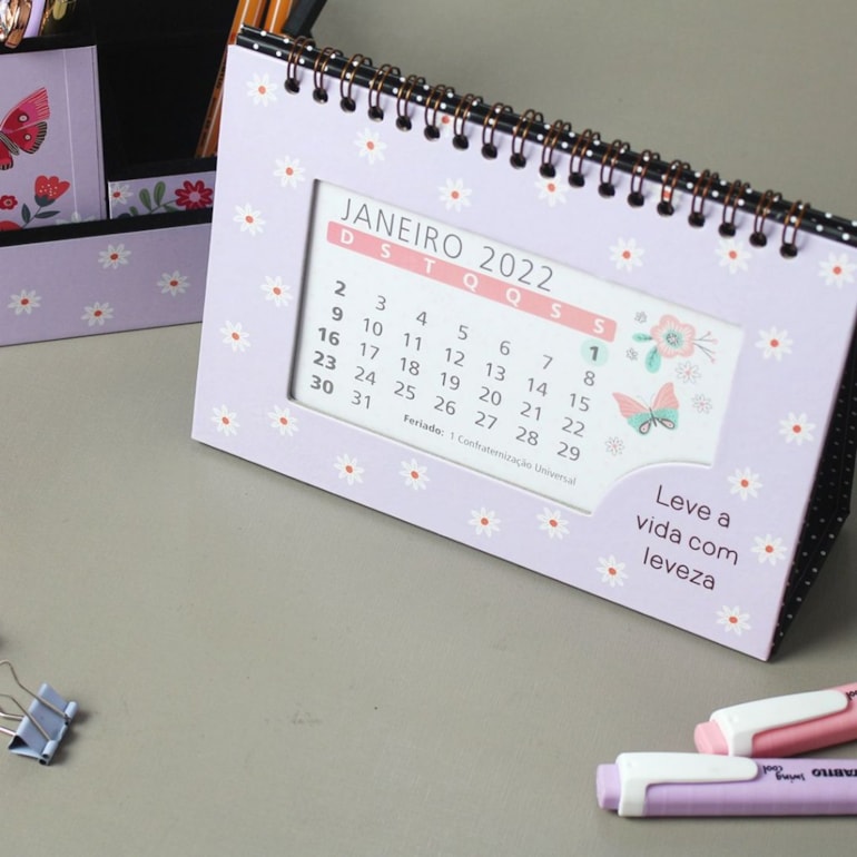 Super fofo, este calendário vem estampado com a frase: “Leve a vida com leveza” em fundo lilás com margaridas. Um verdadeiro mimo para você usar e decorar sua mesa de cabeceira, mesa de trabalho, estudos e muito mais.