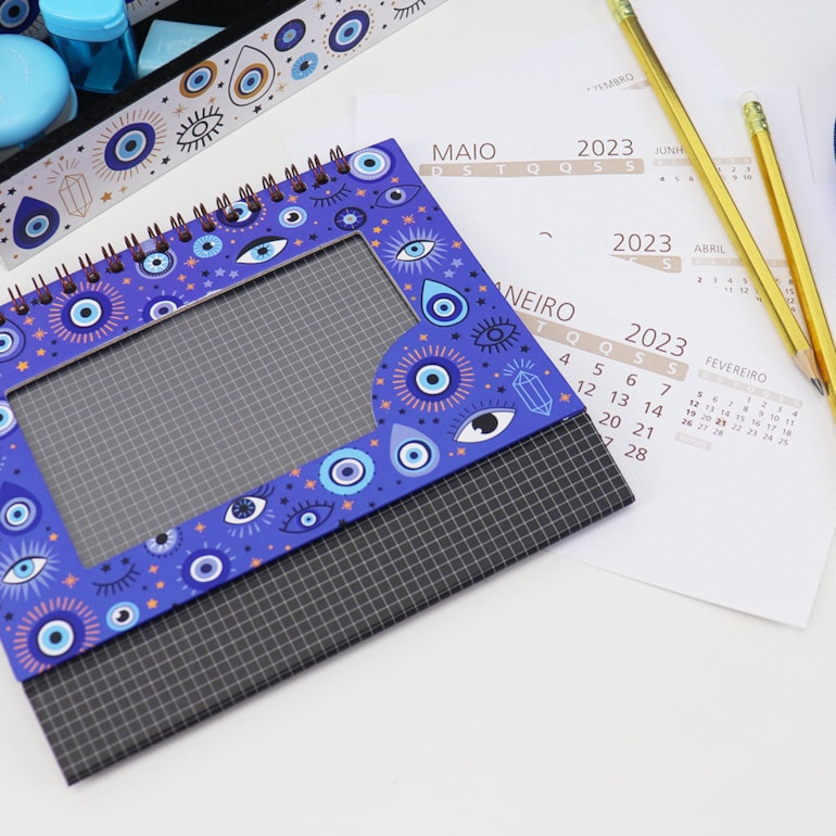 O Calendário de Mesa 2023 Olho Grego Azul vem com um recorte especial, espiral metalizada de cor bronze e capa dura. E, depois você pode ainda utilizá-lo com um porta retrato! Não é incrível?