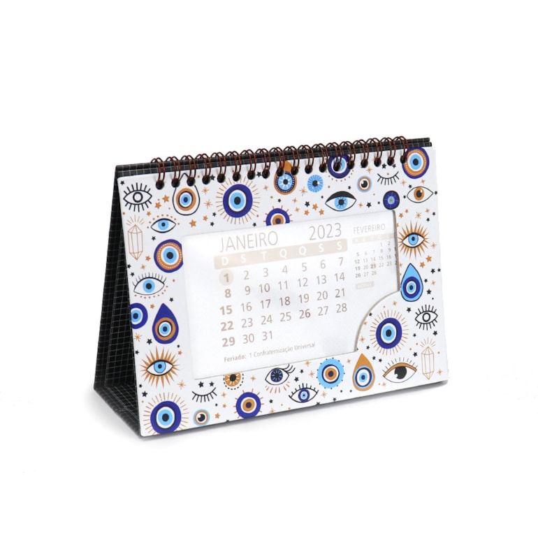 O Calendário de Mesa 2023 Olho Grego Branco vem com um recorte especial, espiral metalizada de cor bronze e capa dura. E, depois você pode ainda utilizá-lo com um porta retrato!