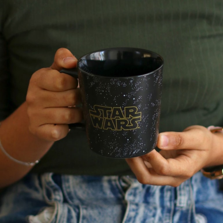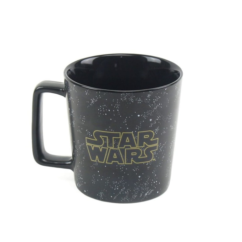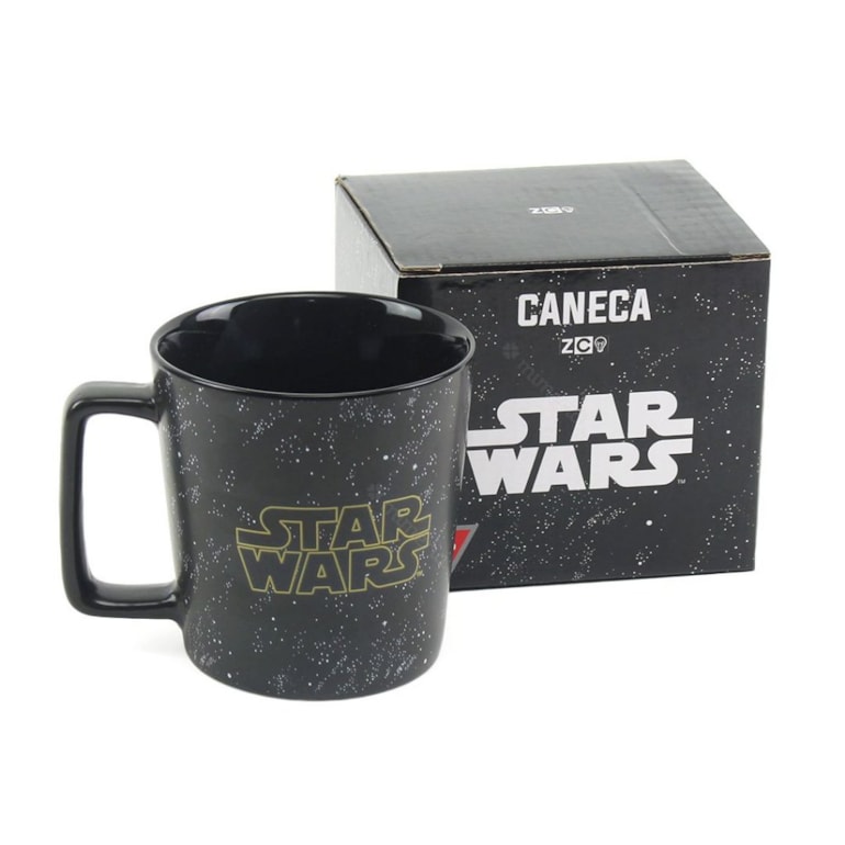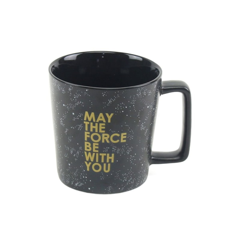 Produzida em cerâmica, tem excelente qualidade e capacidade para até 400 ml de muita bebida gostosa! Ela vem toda trabalhada com um fundo em galáxia, tendo o logo “Star Wars” estampado em uma de suas faces em amarelo, e na outra face vem com a frase “ May the force be with you”. Simplesmente fantástica!
