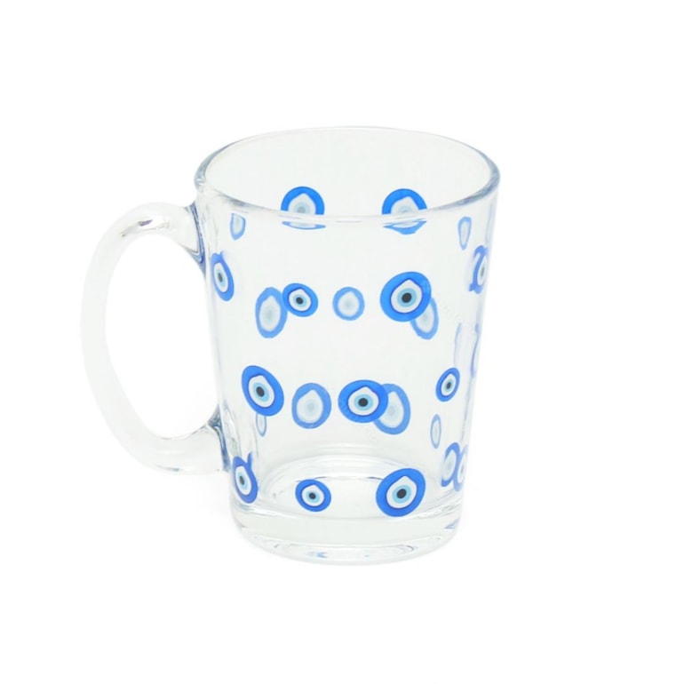 A Caneca de Vidro Olho Grego 300 ml é tudo o que te faltava para completar a sua coleção de olho grego! Ela é prática e muito bonita, vai levar um toque super especial a sua decoração!