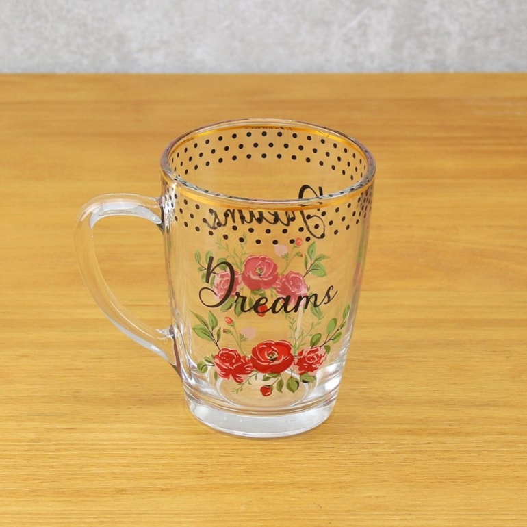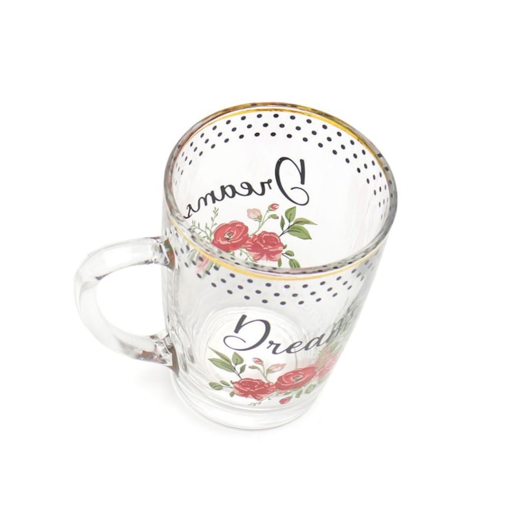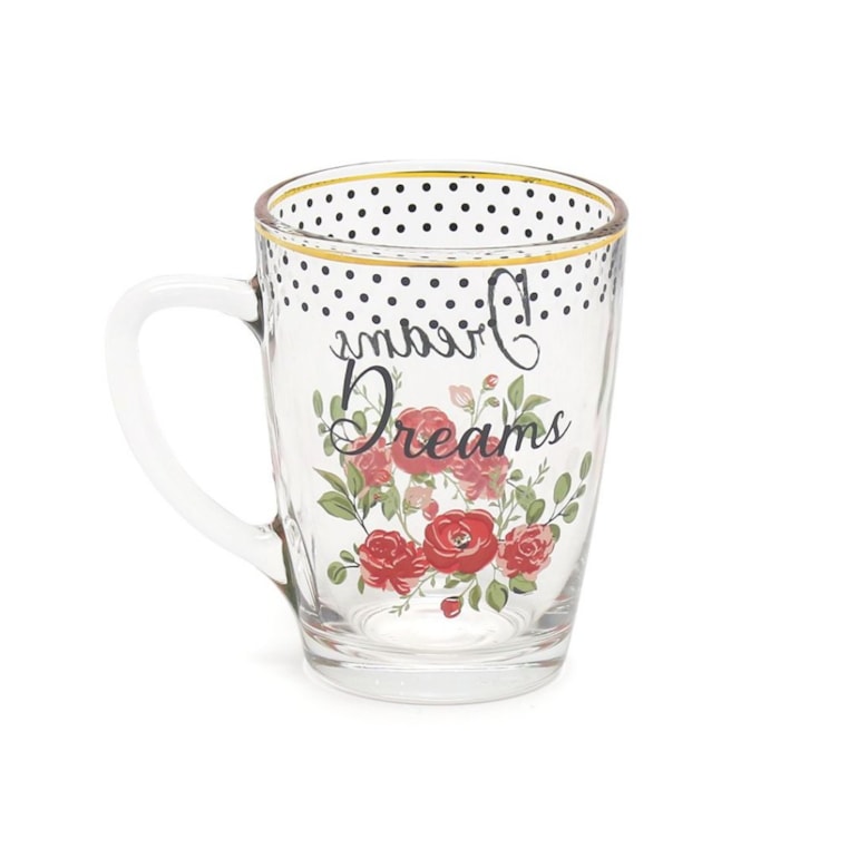 Produzida em vidro, esta xícara tem linda estampa de flores e a palavra “dreams” em fundo transparente com detalhes dourados filetados em ouro. Um verdadeiro mimo!
