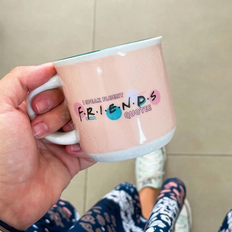 Linda, original, e fora do senso comum, ela vem produzida em porcelana e conta com capacidade para até 200 ml! Muito singular, vem trabalhada com tons de rosa, verde e branco, e conta com a frase “you are my lobster” seguida da estampa de uma lagosta estampada em seu centro. Atrás, vem escrito “I speak fluent F.R.I.E.N.D.S quotes”, que pode ser traduzido para:” eu falo fluente as citações de friends”, se referindo ao tema da caneca!