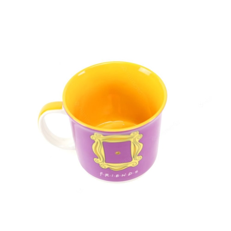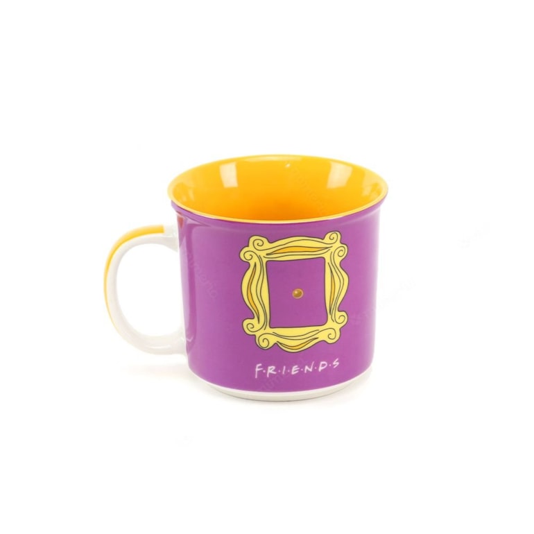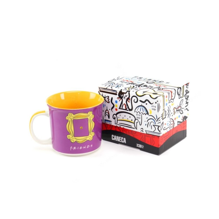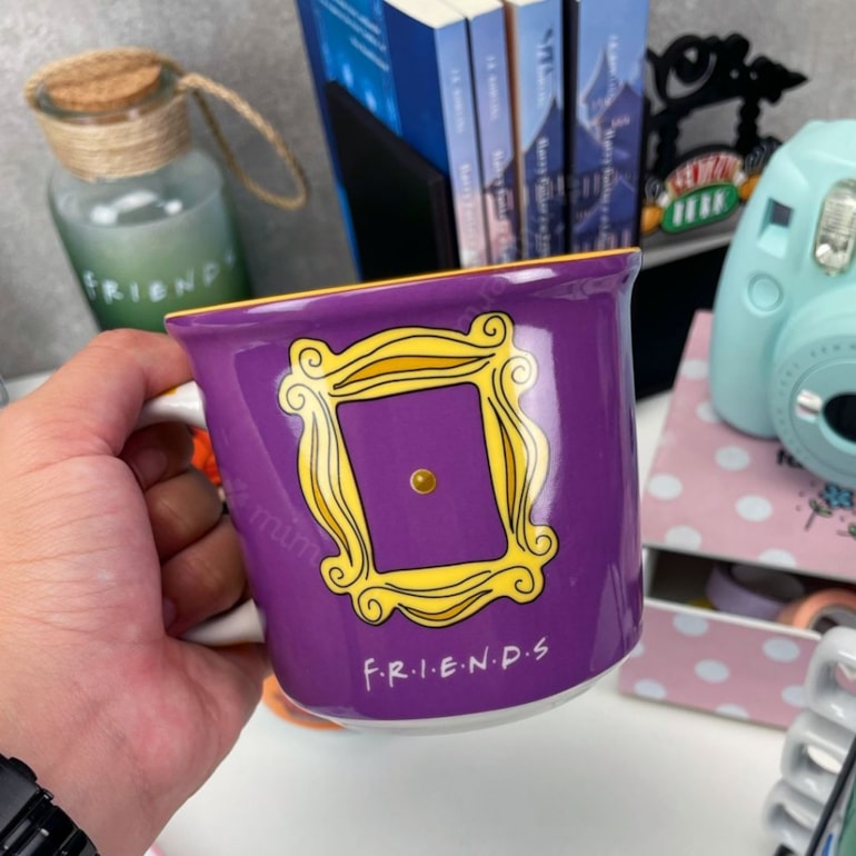 Por dentro, a caneca é amarela, por fora é roxa, com um espelho estampado, aquele que decora a porta da casa de Mônica. Todos os detalhes são impecáveis e inspirados na série. Você vai amar! Perfeita para abrigar seu leite quente, achocolatado ou presentear os fãs de Friends.