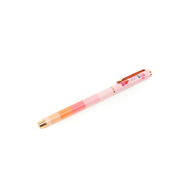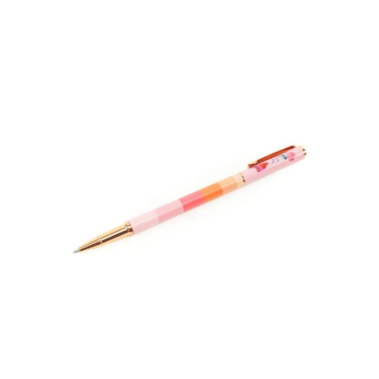 Resistente, vem trabalhada em uma embalagem metálica com detalhes em rose gold, em seu corpo, vem estampada com listras em tons rosados e borboletas e flores na sua tampa. Ela é para fazer parte da sua coleção especial de canetas!