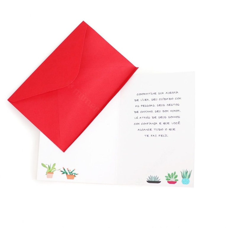 O Cartão Artesanal Cactos vem com um envelope vermelho para que você possa colocar uma quantia em dinheiro ou escrever uma declaração a punho e dar em conjunto com o cartão, ele também vem com uma linda mensagem em seu interior “Compartilhe sua alegria de viver, seu cuidado com as pessoas, seus gestos de carinho, seu bom humor. Vá atrás de seus sonhos com confiança e que você alcance tudo o que te faz feliz.”! Um presente perfeito para mulheres resilientes e especiais a sua volta!
