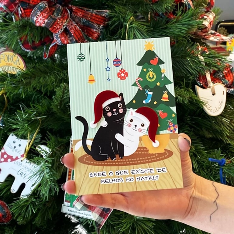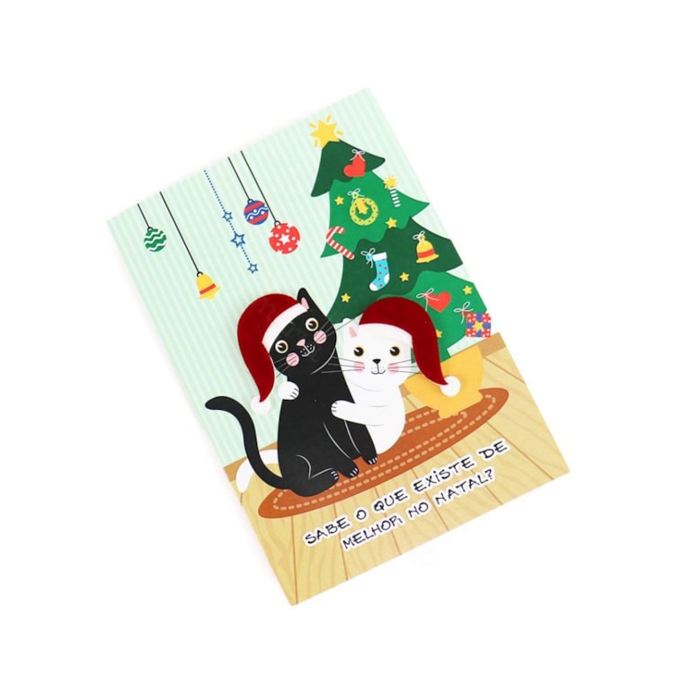 O Cartão Artesanal Natal, Gatos com Gorro vem com um envelope vermelho para você depositar uma declaração pessoal ou uma quantia em espécie e dar de presente a pessoa escolhida, ele também conta com uma pergunta em sua capa “ Sabe o que existe de melhor no natal?” e vem seguido de uma linda mensagem em seu interior “É estar com alguém especial juntinho de mim...Você, a pessoa que mais amo nesta vida!”, o mimo perfeito!