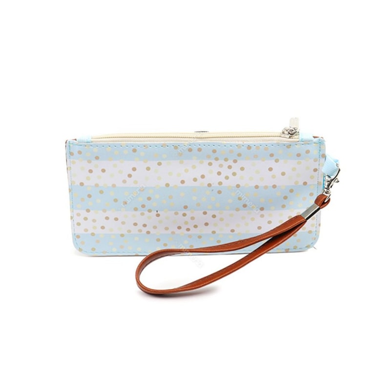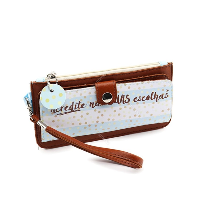 Com ótimo acabamento, esta carteira tem linda estampa de confetes prateados e da frase: “Acredite nas suas escolhas” em fundo azul e branco. Perfeita para você combinar com outros mimos da mesma coleção e levar ainda mais encanto para seus dias!