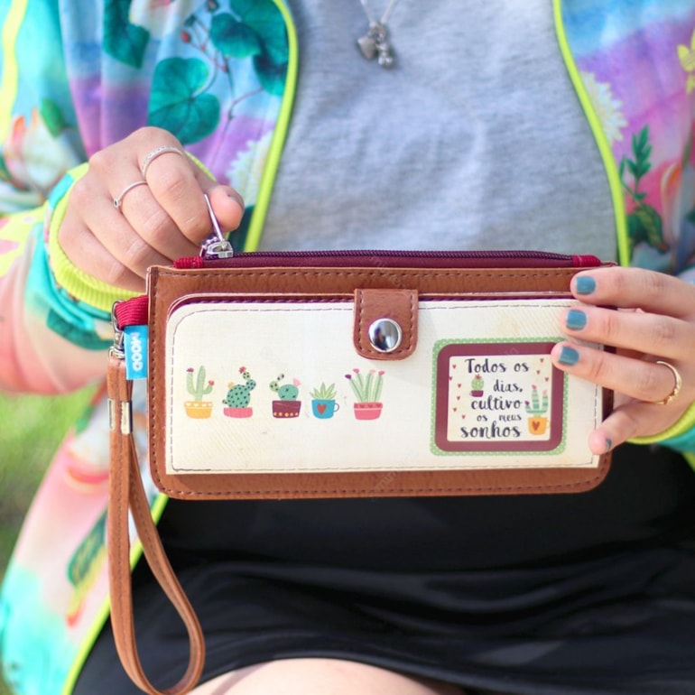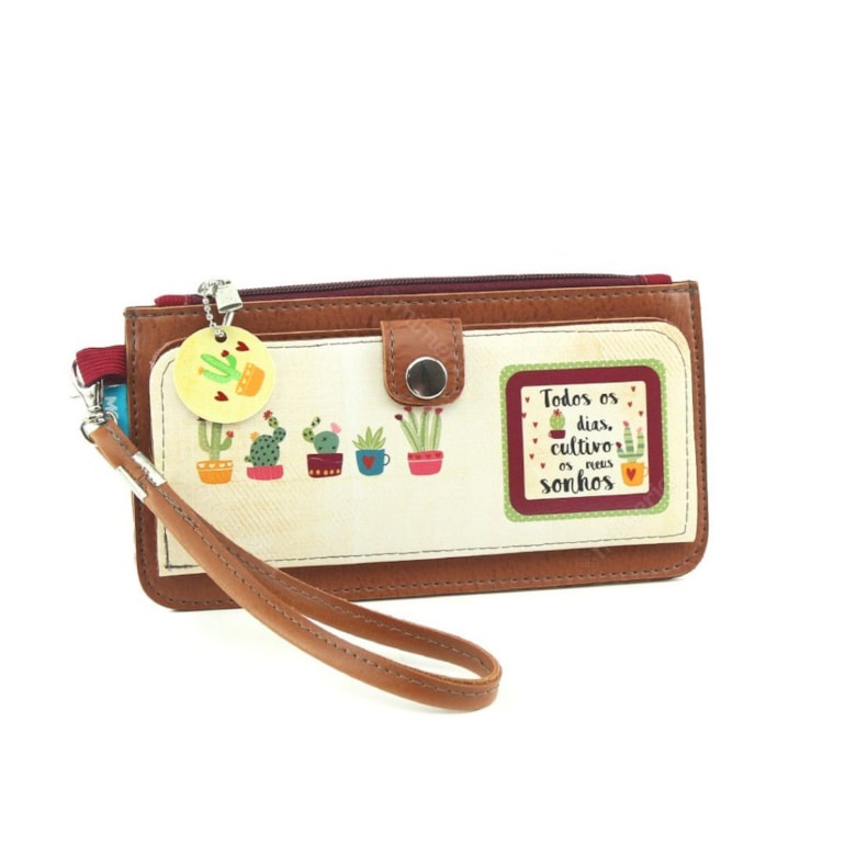 Essa Carteira Slim Cactus é perfeita para você organizar dinheiro, moedas, cartões e documentos. É estampada com detalhes em caramelo e vinho, além de ter vasinhos e canecas com cactos e uma frase inspiradora: "Todos os dias cultivo os meus sonhos!" - Cultive os seus e colha os bons frutos da vida.