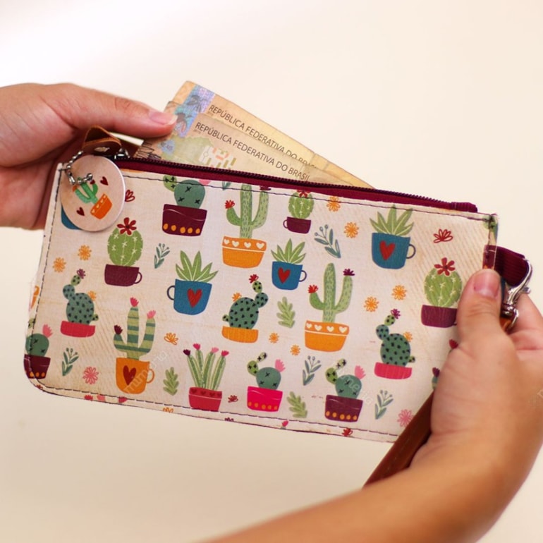 A Carteira Slim Cactus é muito linda! Com ótimo tamanho é ideal para levar na mão, pois conta com alça de segurança pra você preender no pulso ou carregar na bolsa ou mochila. Conta com um bolso interno grande com zíper e um bolso externo com 8 espaços para colocar seus cartões.