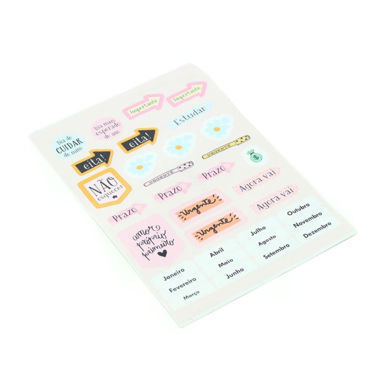 Super prática, esta cartela vem com 34 adesivos para você organizar seus planos financeiros, compromissos, marcar no material o início de cada mês, fazer checklist, marcar coisas importantes e tudo o que você imaginar.