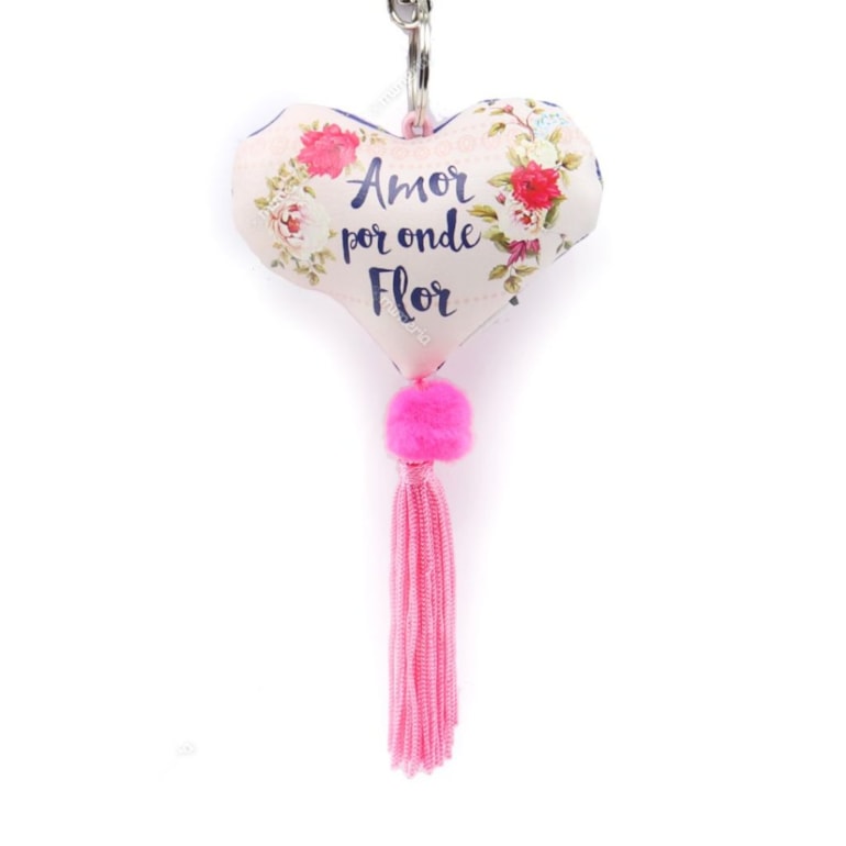 Este chaveiro tem design diferenciado em forma de almofadinha em forma de coração escrito: "Amor Onde Flor". Esse chaveirinho conta também com um penduricalho super fofo. Uma graça!