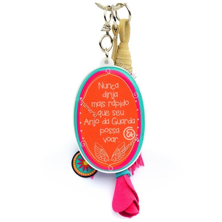 O Chaveiro Anjo da Guarda é fabricado em material plástico com resina acrílica e traz também penduricalhos que combinam com a estampa. No verso traz os dizeres "Nunca dirija mais rápido do que seu anjo pode voar."