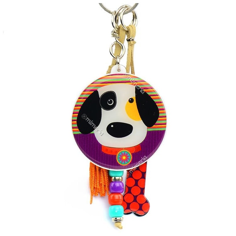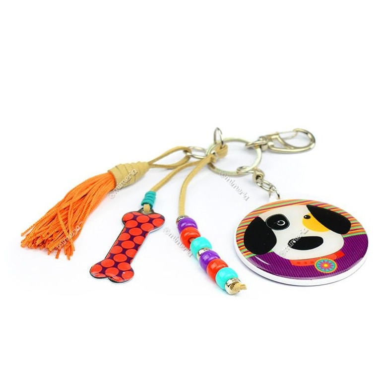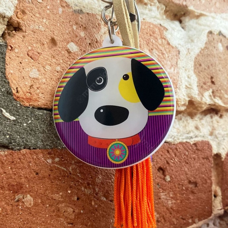 O Chaveiro Cachorro Felicidade é um encanto! Além de organizar suas chaves, você vai levar muito encanto para sua bolsa, mala ou mochila. Com o formato da tag redonda, esse chaveirinho traz a estampa da carinha de um cachorro muito fofo no fundo roxo e com listras laranjas, rosas e roxas. Muito meigo!l!