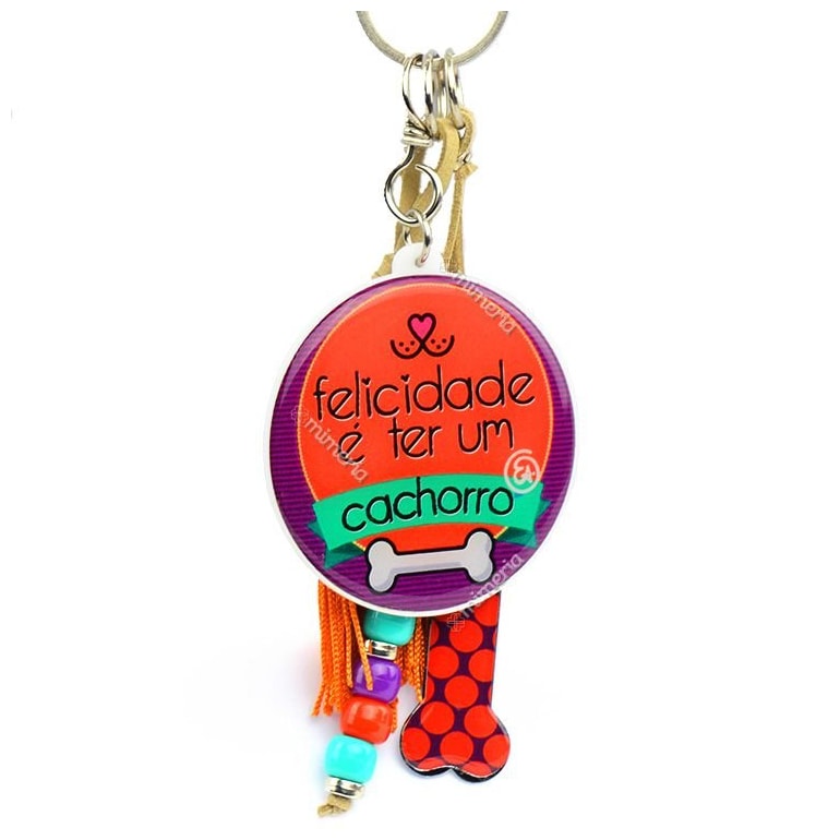 Fabricado em material plástico com revestimento em resina acrílica, esse chaveiro traz penduricalhos fofíssimos que remetem a estampa, como um ossinho estilizado. Simplesmente demais! No verso traz a frase: "Felicidade é ter um cachorro". Realmente cachorro é tudo de bom!!!