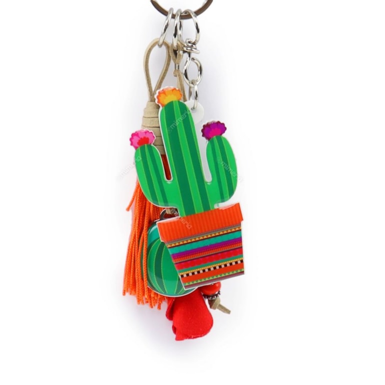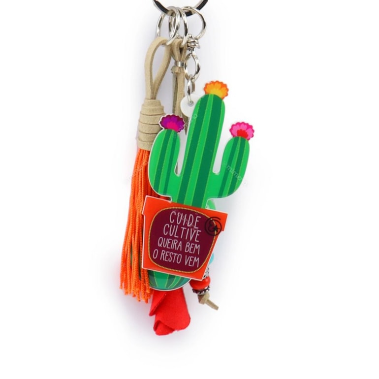 O Chaveiro Cacto Mexicano é fabricado em material plástico com revestimento em resina acrílica, tem o formato de um lindo cacto da espécie mandacaru com três florzinhas nas pontas em um vaso super colorido com vários penduricalhos meigos que combinam com a estampa. No verso traz a frase inspiradora: "Cuide, cultive, queira bem o resto vem". Quanto mimo!!!