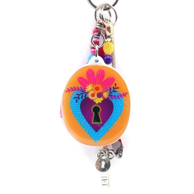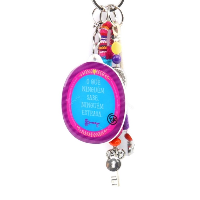 Fabricado em material plástico com revestimento em resina acrílica, o Chaveiro Cadeado tem a estampa de um cadeado nas cores laranja, azul e roxo, com penduricalhos fofíssimos, como uma mini chavinha. No verso traz a frase: "O que ninguém sabe, ninguém estraga".