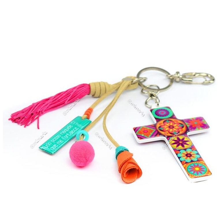 Fabricado em material plástico com resina acrílica, o Chaveiro Cruz Color traz também alguns penduricalhos fofos que combinam com a estampa. No verso está escrita a célebre frase do apóstolo Paulo de Tarso em carta aos filipenses: "Tudo posso naquele que me fortalece."