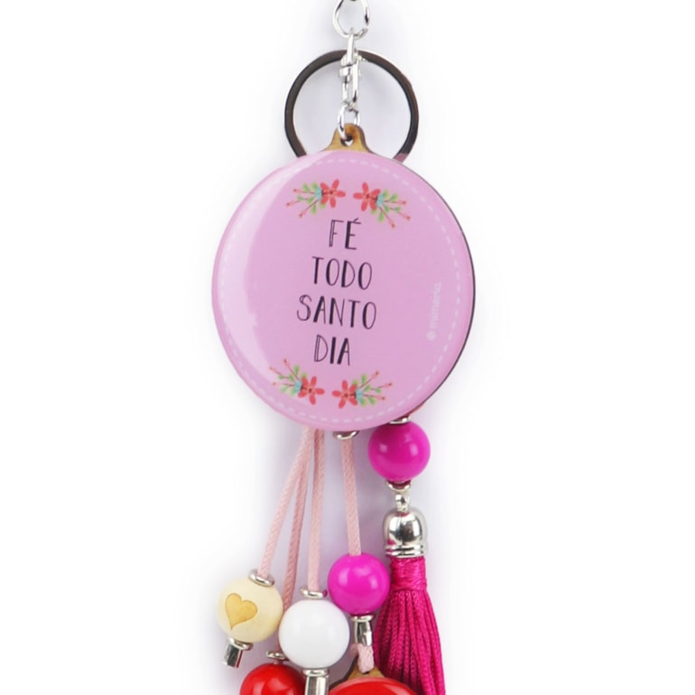 O Chaveiro Divino Espírito Santo Rosa é fabricado em MDF, resina acrílica, ganchinho e argola de metal, e traz também penduricalhos. No verso traz a frase: "Fé todo santo dia". Não é inspirador?