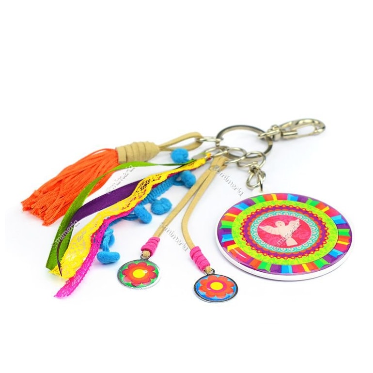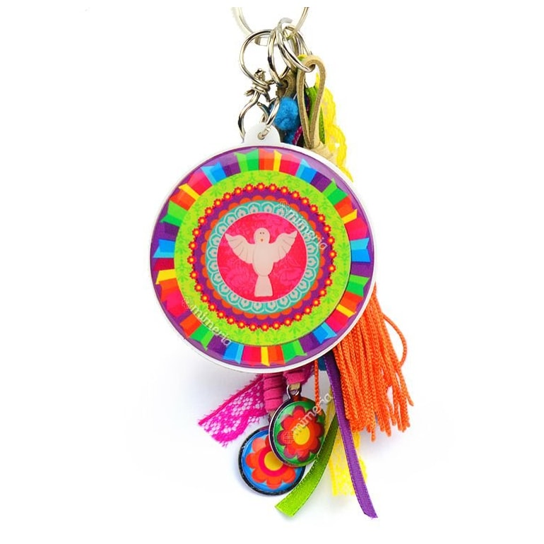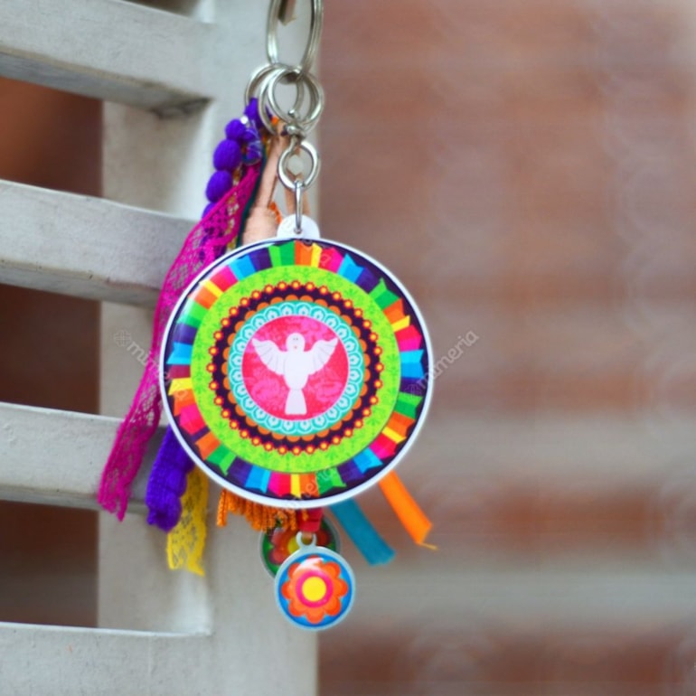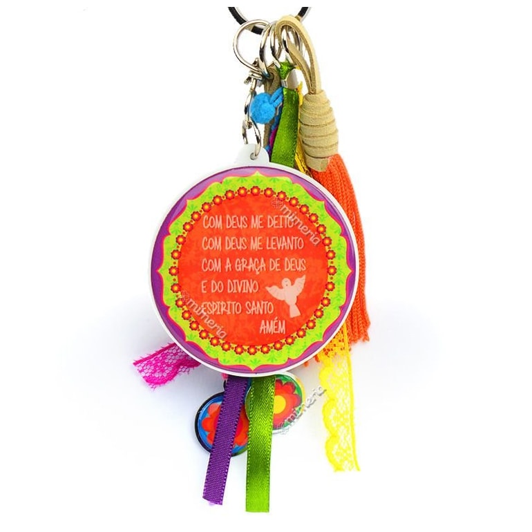 O Chaveiro Espírito Santo é fabricado em material plástico com resina acrílica e traz também penduricalhos que combinam com a estampa, como várias fitinhas e mini pompons. No verso traz a frase: "Com Deus me deito, com Deus me levanto, com a graça de Deus e do Espírito Santo, Amém!". Perfeito para levar com você e proporcionar proteção.