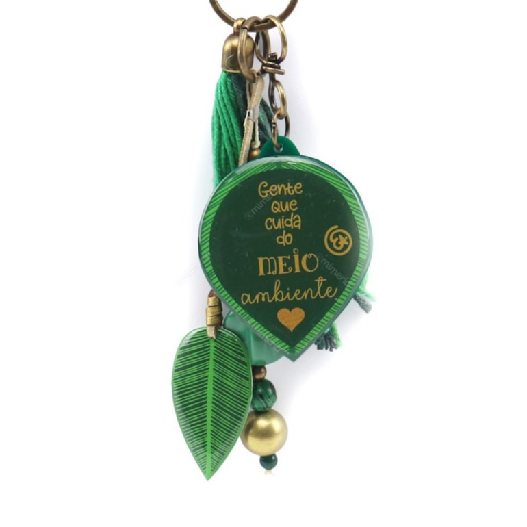 Produzido em resina acrílica, tem o formato da tag em formato de uma folha verde escura, esse chaveirinho traz ainda penduricalho da mesma cor da tag com detalhes em dourado. Perfeito!!! E no verso traz a frase: "Gente que cuida do meio ambiente!".