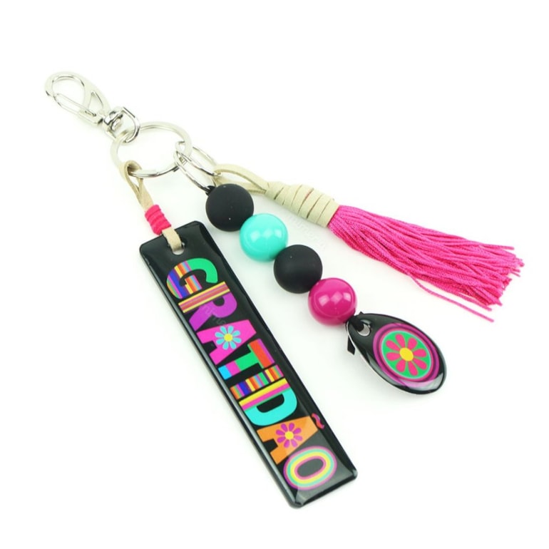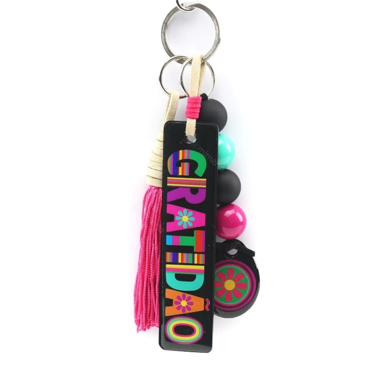 O Chaveiro Frase Gratidão ainda vem com uns penduricalhos super fofinhos, com miçangas e franjinha. Perfeito também para presentear pessoas queridas em datas especiais!