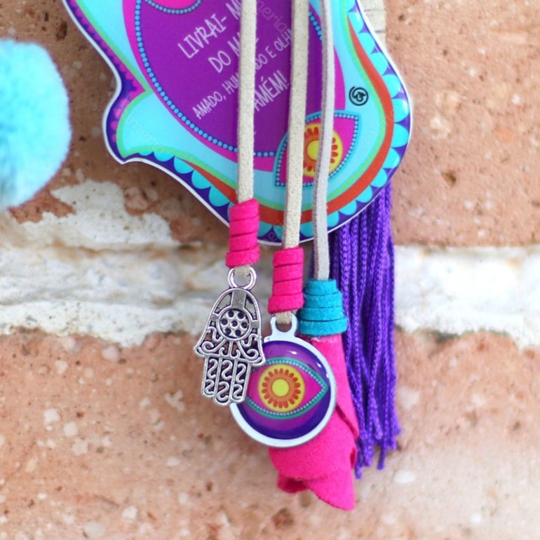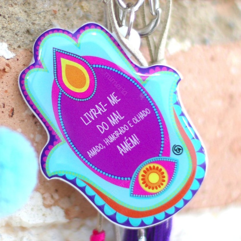 O Chaveiro Hamsa Colorido é feito em material plástico com resina acrílica e acompanha alguns penduricalhos fofos que combinam com a estampa da Mão de Fátima. No verso traz uma oração: "Livrai-me do mal amado, humorado e olhado, Amém!"