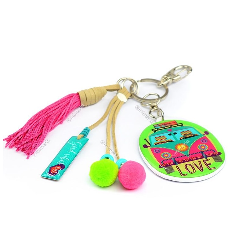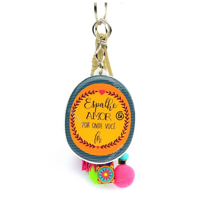 Esse chaveirinho é fabricado em material plástico com resina acrílica e traz também penduricalhos fofos que combinam com a estampa, como uma plaquinha "Good Vibes" e dois pompons super fofos. No verso do chaveirinho você encontra a frase: "Espalhe amor por onde você for" Bora viajar!!!!