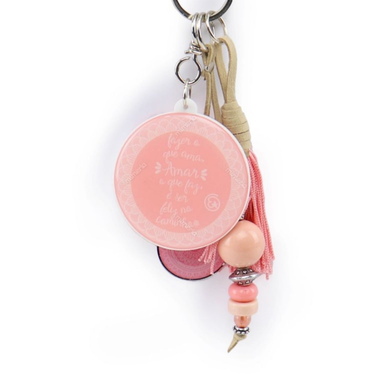 Fabricado em material plástico com resina acrílica, o Chaveiro Mandala Rosa Chá traz penduricalhos fofíssimos que combinam perfeitamente com a estampa, como uma mini mandalinha! No verso traz a frase inspiradora: "Fazer o que ama, amar o que faz, é ser feliz no caminho”.