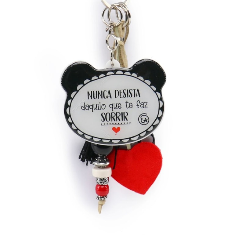 Produzido em material plástico com resina acrílica, o Chaveiro Panda tem um formato oval e traz também penduricalhos que combinam com a estampa. No verso traz os dizeres "Nunca desista daquilo que te faz sorrir”. Que lindo!