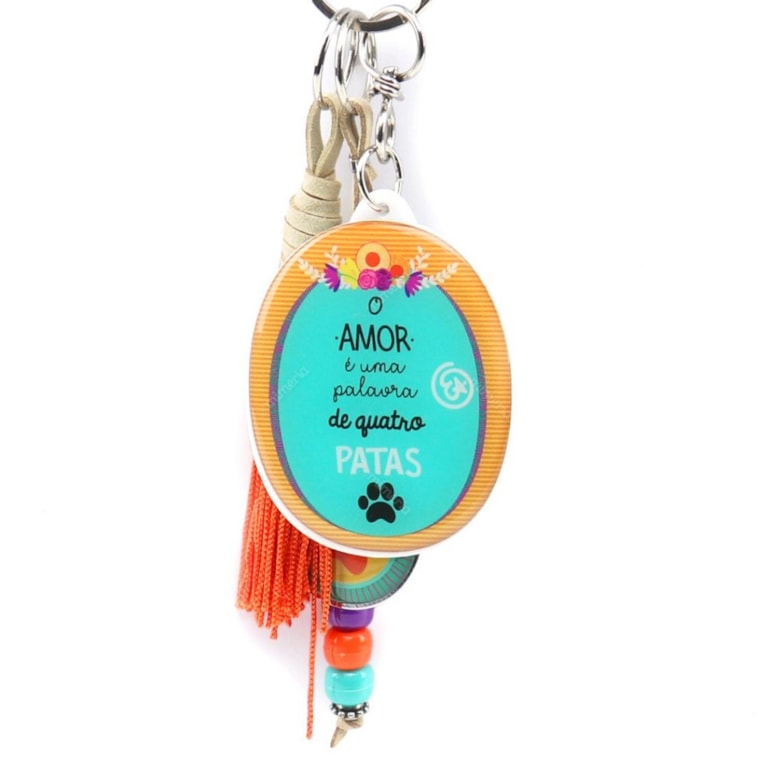 Fabricado em material plástico com resina acrílica, esse chaveirinho traz também penduricalhos fofos que combinam com a estampa, como uma patinha estilizada. No verso traz a frase: "O amor é uma palavra de quatro patas".